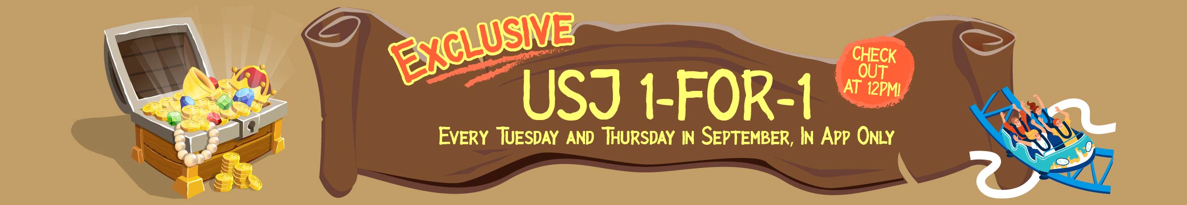 • All 1-for-1 USJ Promo codes entitles users to JPY8,600 discount on Product "Universal Studios Japan: Admission Ticket | Osaka, Japan (Officially Authorized)" (ID: 35992), specified package "Universal Studios Japan Ticket" - 1-Day Studio Pass adult tickets only, with a minimum spend of JPY17,000 . Limited checkouts only. Valid from 3 Sept to 26 Sept 2024, every Tuesday and Thursday 12pm to 2pm (GMT+8) or until fully checked out, whichever is earlier.
