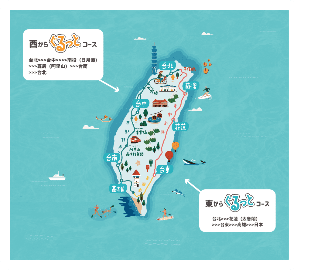 古き良き文化と現代の息づく都市、自然と美しい海、そして人々の温かさ。台北の賑やかな街並みから始め、台中や高雄の芸術と歴史に触れ、日月潭の静寂な湖畔を散策、阿里山の清新な空気を感じ、台南の古都の魅力に浸り、太魯閣の絶景を眺め、台東の大自然に圧倒され、台湾はまるで宝箱のような魅力が詰まっています。