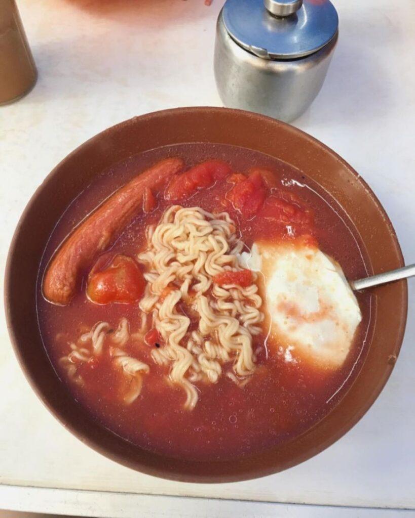 토마토 통조림에 소고기를 넣고 라면으로 끓여 냈다. 토핑으로는 계란이 올라간다.