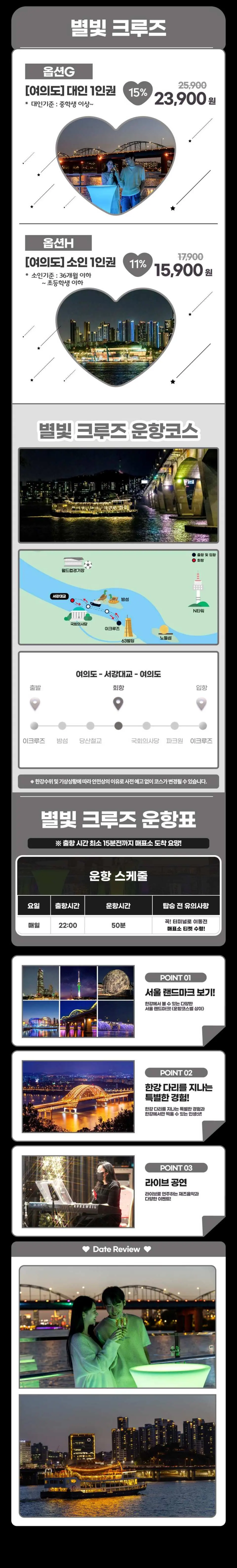 각 테마 한강 유람선은 독특한 분위기를 선사합니다. 선셋 크루즈는 해가 질 무렵 하늘의 다채로운 색감을 보여줍니다. 문라이트 뮤직 크루즈는 종종 라이브 공연과 함께 평화로운 저녁 분위기를 제공합니다. 불꽃놀이 뮤직 크루즈는 주로 특정 날짜에 음악과 동기화된 화려한 불꽃 쇼를 선보입니다. 스타라이트 크루즈는 밤하늘 아래 조명이 켜진 도시 스카이라인을 감상하는 데 중점을 둡니다.