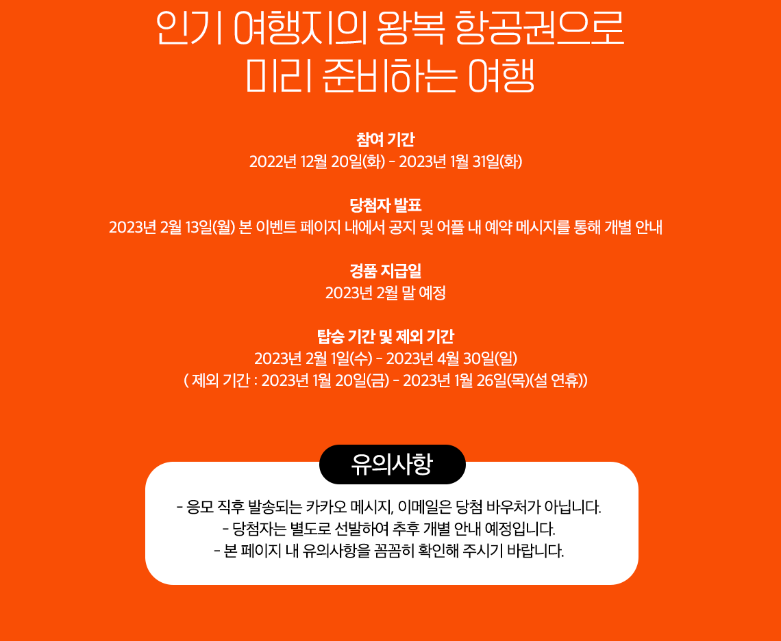 • 항공권 예약시 유류할증료 및 공항이용료는 당첨자 본인 부담이며 자세한 사항은 해당 항공사 고객센터를 통해 확인할 수 있습니다.