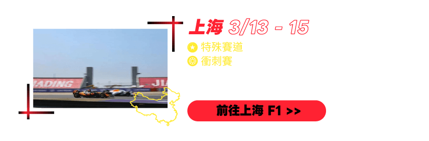 在 2026 年上海一級方程式賽車 Formula 1 (F1) 中觀看不間斷的比賽和娛樂活動,賽事會在 2026年3月13日 - 2026年3月15日進行!