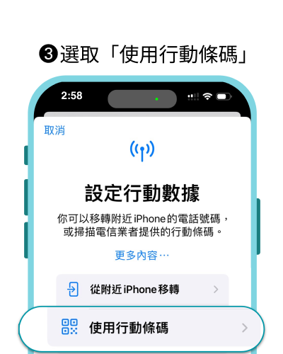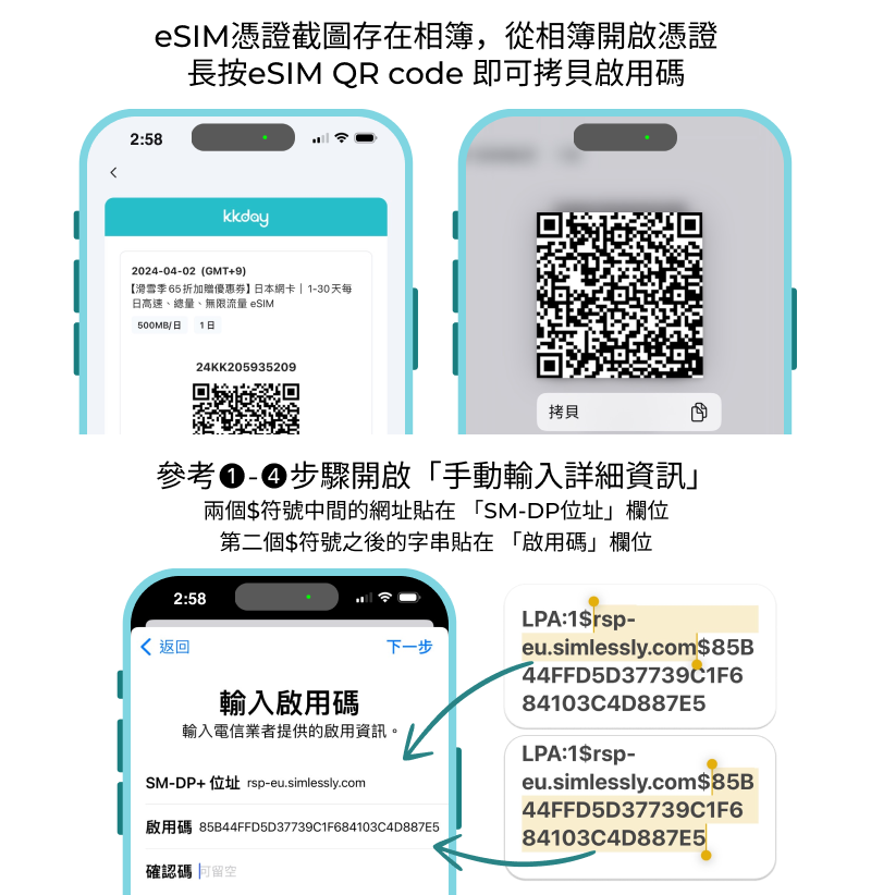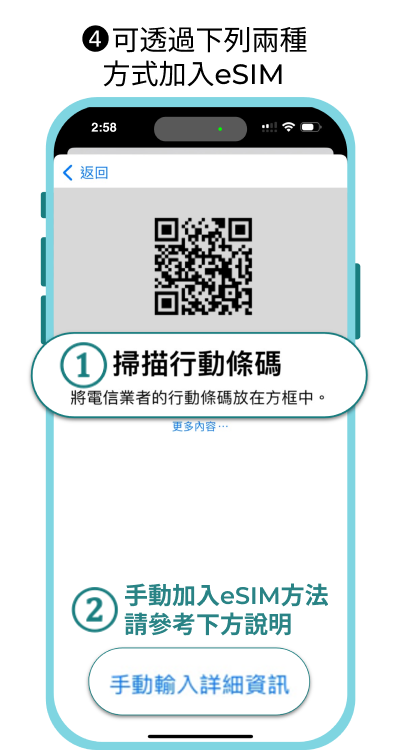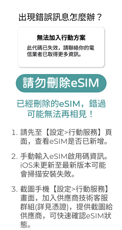 手機如果非最新iOS版本,透過相機掃描eSIM QR code 可能會失敗,需手動輸入eSIM資訊啟用。
