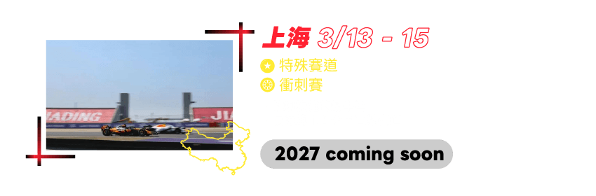在 2026 年上海一級方程式賽車 Formula 1 (F1) 中觀看不間斷的比賽和娛樂活動,賽事會在 2026年3月13日 - 2026年3月15日進行!