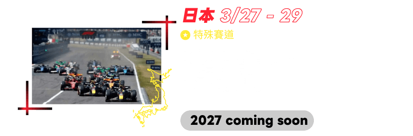 2026年F1日本大獎賽門票,含三日賽程入場資格,於經典鈴鹿賽道舉行。完整觀賞練習賽、排位賽與正賽,全場感受賽車競速魅力。現於KKday下訂,可即訂即出,搶先掌握賽事席位!