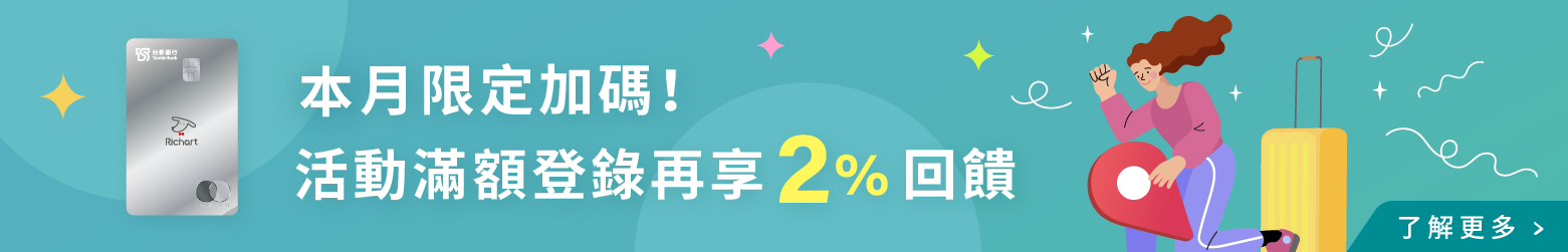 活動適用對象:本活動僅限台新 Richart 卡友結帳切換玩旅刷參加,單筆訂單享最高 3.3% 台新 Point (信用卡) 回饋。